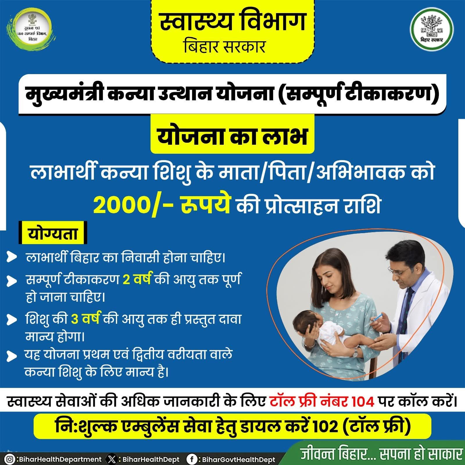 Mukhyamantri Kanya Utthan Yojana 2026 में ₹2000 की प्रोत्साहन राशि उन बालिकाओं को मिलती है जिनका जन्म बिहार में हुआ हो और सम्पूर्ण टीकाकरण 2 वर्ष की आयु तक पूरा हो गया हो। सभी वैक्सीन समय पर लगी होनी चाहिए, जैसे BCG, OPV, DPT आदि।